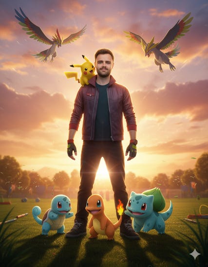 Ultra-realistic 8K cinematic portrait of the young man in the photo (without any facial modification) as a Pokémon Trainer, centered and posing confidently, smiling very subtly and naturally. Surrounding the user are friendly Pokémon: Pikachu, Bulbasaur, Charmander, and Squirtle, interacting in playful and dynamic ways, some leaning towards the user. The background is a vibrant, sunlit training ground, featuring soft shadows, cinematic lighting, and a spectacular sunset sky with warm orange and pink hues. In the sky, Legendary Pokémon soar majestically, illuminated by the golden sunlight, appearing larger and more prominent for an epic effect. Lifelike Pokémon fur, clothing, and textures, HDR lighting, sharp details, natural yet vivid colors, realistic lens flares, wide-angle perspective, shallow depth of field, and subtle motion blur for dynamic energy. Framed composition like a heroic game poster, capturing a joyful atmosphere — adventurous and epic Pokémon trainer.
