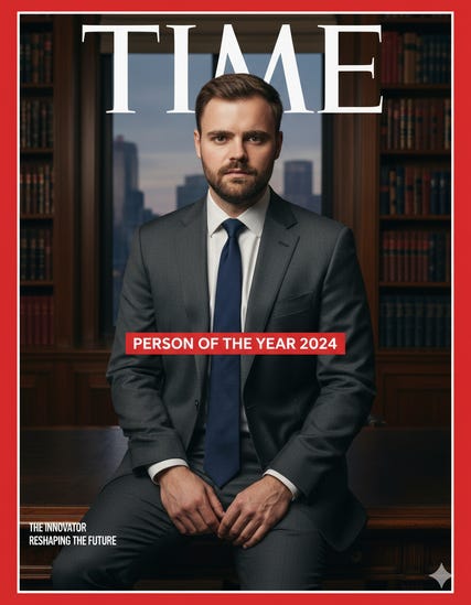 Create a Time Magazine cover-worthy portrait with authoritative pose, professional attire, and sophisticated background setting. Include the iconic red border frame, Time logo, and “Person of the Year” typography with appropriate year designation.
