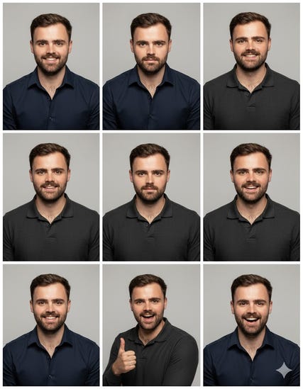 Turn the photo into a 3x3 grid of photo strips with different studio-style poses and expressions.