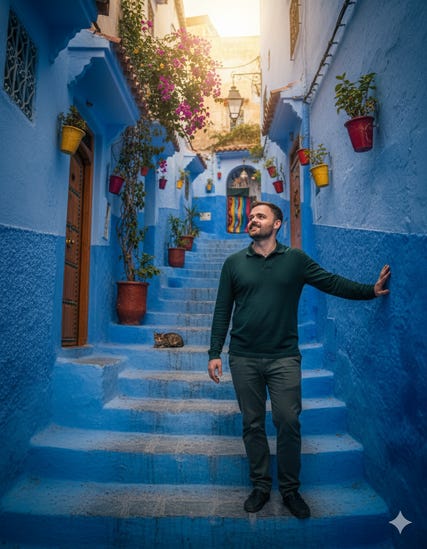 Edit this image to place a man in the iconic blue-painted streets of Chefchaouen, Morocco. Position her gracefully ascending blue-painted stone steps, hand gently trailing along the textured wall, captured in a dynamic pose looking up and away with natural joy. She maintains her original tourist clothing. Enhance the lighting to golden hour with warm sunlight streaming between buildings, creating dramatic shadows and highlights on the vibrant blue walls (ranging from azure to deep cobalt). The narrow street features wooden doors with ornate brass knockers, cascading bougainvillea in magenta and purple, terracotta pots with green plants, and traditional Moroccan lanterns casting decorative shadows. Add a stray cat sitting on stone steps for authentic atmosphere. Photorealistic style with rich, saturated colors, slight vignette, and shallow depth of field to create dreamy bokeh in the background.