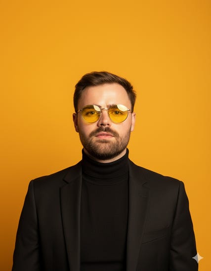 Studio photography of me in a black suit, black turtleneck and round sunglasses with translucent yellow lenses. Vibrant orange background. Unique poses from the front.