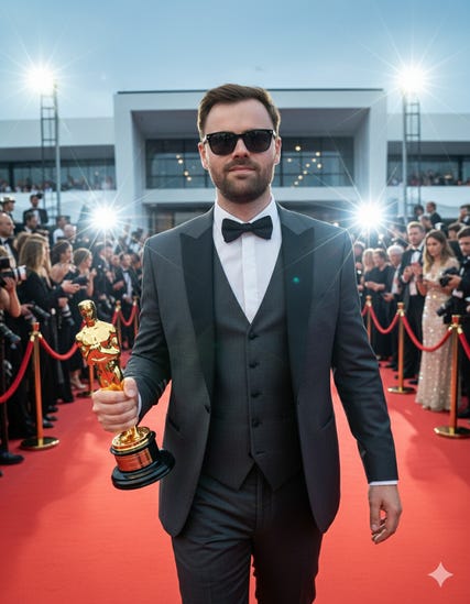 A low-angle close-up shot in a three-piece tuxedo, confidently walking the red carpet at the Cannes Film Festival. Paparazzi flashbulbs erupt all around him. He’s wearing designer shades, holding a gold statue in one hand, and giving a smug smile. Velvet ropes, elegant evening dresses, and modern architecture in the background.