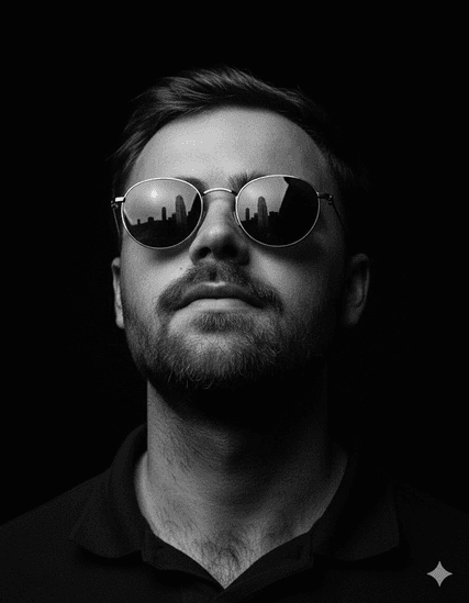 Dramatic, ultra-realistic close-up in black and white with high-contrast cinematic lighting from the side, highlighting the contours of his face and beard, casting deep shadows. He wears round, reflective sunglasses. He gazes confidently upward into a dark void. The sunglasses reflect a city’s towering skyline. The atmosphere is mysterious with a minimalist black background. Details in 4K. Keep the subject’s exact facial structure, hair texture, the original photo.