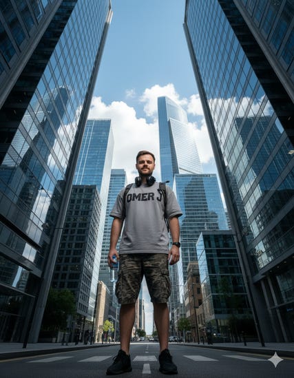 A hyper-realistic, cinematic low-angle portrait of a young man standing confidently in the middle of a modern city street, surrounded by towering skyscrapers curving inward toward the sky. He wears a casual oversized gray t-shirt with bold lettering text OMER J, camouflage cargo shorts, and carries a backpack. Black headphones rest around his neck, and he holds a water bottle in one hand. The lighting is natural and dramatic, with clear blue skies and scattered clouds above, emphasizing the sense of scale and urban energy. The composition creates a powerful, larger-than-life perspective, making the subject appear heroic and adventurous—with ultra-detailed textures in clothing, skin, and architecture.