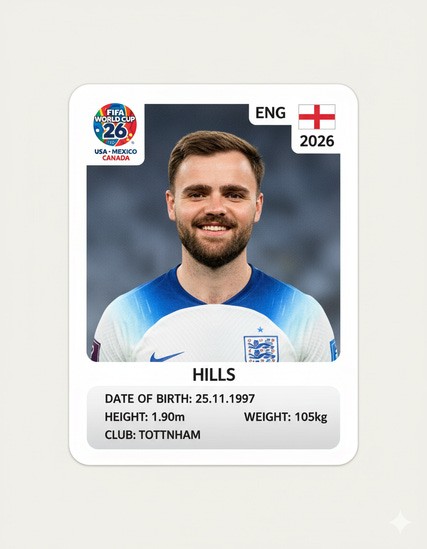 Panini FIFA World Cup 2026 sticker card, official collectible style. Layout with rounded edges and a light background. In the upper left corner, the official logo of the 2026 FIFA World Cup USA. In the upper right corner, the flag of the player’s country with the three-letter acronym (’ENG’) and the year of the player’s World Cup debut (2026). In the center, a photo of the player (use the image provided), showing him from the shoulders up, in the official English national team uniform. Blurred background in bluish/gray tones. At the bottom, an area with personal information: Date of birth (November 25, 1997). Full name highlighted (HILLS). Height and weight (1.90m and 105kg). Current club (Tottenham). High-resolution design, realistic photo style, identical to the official Panini stickers.