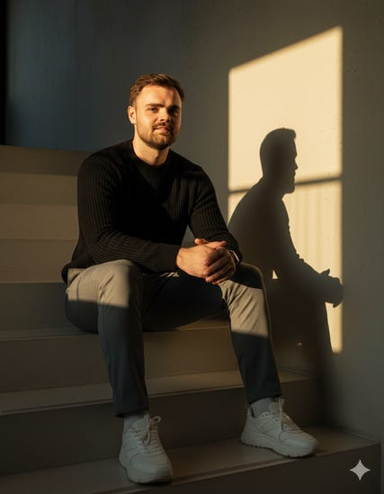 Ultra-realistic vertical photo (9:16). A young English man (use uploaded face, 100% identity lock, no alteration) sits on indoor stairs beside a matte concrete wall. A rectangular beam of golden sunlight from a window hits the wall, creating a crisp shadow silhouette inside the bright frame.