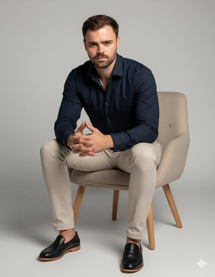 Studio portrait of a confident man sitting on a modern beige armchair with wooden legs, leaning slightly forward with his hands together. He wears a dark navy blue dress shirt with the top buttons open, light beige slim-fit pants, and black loafers with tan soles. He has short dark brown hair styled with texture, a trimmed full beard, tanned skin, and an intense confident gaze directed at the camera. The background is minimalist light gray with a smooth gradient, evenly lit with soft natural studio lighting. The mood is cinematic and fashion editorial, with high realism and fine details. Shot with a 50mm lens at f/2.8, vertical framing, full-body composition. The subject from the uploaded image, maintaining the exact real face, hairstyle, skin tone, and body identity unchanged.