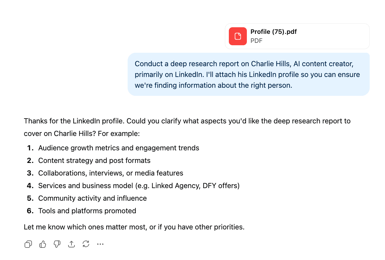 “Conduct a deep research report on Charlie Hills, AI content creator, primarily on LinkedIn. I’ll attach his LinkedIn profile so you can ensure we’re finding information about the right person.”